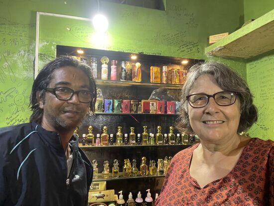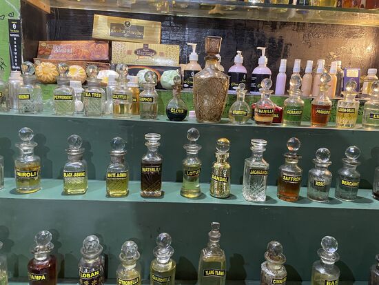Ali, der Inhaber zeigt mir zuerst wie man die Räucherstäbchen macht. Selstverständlich nur mit natürlichen Materialien. Jasmin, Rose, Sandelholz, Lotus, Zimt. Dann führt er mich in das kleine Hinterzimmer, lädt mich ein, mich auf dem niedrigen Kissen zu setzen. Er macht mir einen wunderbaren Chai und ganz schnell sind wir in einem tiefsinnigen Gespräch. Ganz nebenbei zeigt er mir dabei verschiedene Öle. Gibt einen Tropfen auf die Handrücken, die Handgelenke, lässt mich schnuppern, an weissem und schwarzem Jasmin, weiss wofür sie gut sind, weiss was gegen Depression hilft, gegen Kopfweh. Gegen alle Krankheiten gibt es den richtigen Duft. Und meistens reicht ein einzelner Tropfen.