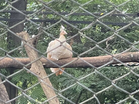 Im nächsten Gehege sitzt ein weisser Pfau. Ich hatte schon gehört, dass es im hiesigen Zoo einen weissen Pfau gibt. Leider hockt er nur oben auf den Ästen, und seine langen Federn sind zur Zeit nicht ausgebildet. Aber mit seinem weissen Gefieder und seinem zierlichen Krönchen ist er auch so eine Augenweide.