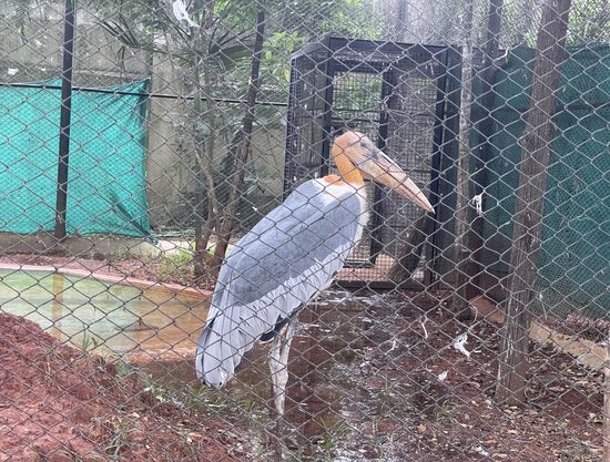 Was man vom nächsten Vogel nicht unbedingt behaupten könnte. Der kleine Adjudant, eine Storchenart. Ich bin mir nicht ganz sicher, aber ich hatte einen ähnlichen Vogel schon im Zoo in Nivandrum gesehen. Dort hiess er allerdings Buntstorch und hatte farbigere Federn. Dieser hier wird auch Sunda-Marabu genannt. Es ist ein Paar, das hier lebt und auch dieser Vogel imponiert durch seine Grösse. Er hat eine Flügelspannweite von 210 cm. Die beiden stolzieren durch das Gehege. Auch hier ist es wieder ein spezieller Schnabel, der irgendwie in den Kopf übergeht, so dass es scheint, dass die Augen direkt im Schnabel liegen.