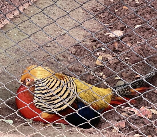 Der nächste Vogel besticht durch seine Farbenpracht. Ein paar stolzieren durch das Gehege und es ist gut sichtbar, dass es sich um einen Fasan handelt. Und was für einer. Es ist ein Goldfasan, verbreitet vor allem in den Wäldern Chinas. Wieder ist es sehr schwierig, ein gutes Bild eines Vogels zu bekommen, zum Glück sitzt ein Männchen dicht beim Gehege, so dass ich es mit allen Tricks irgendwie aufs Bild bekomme.