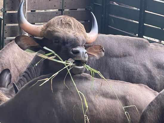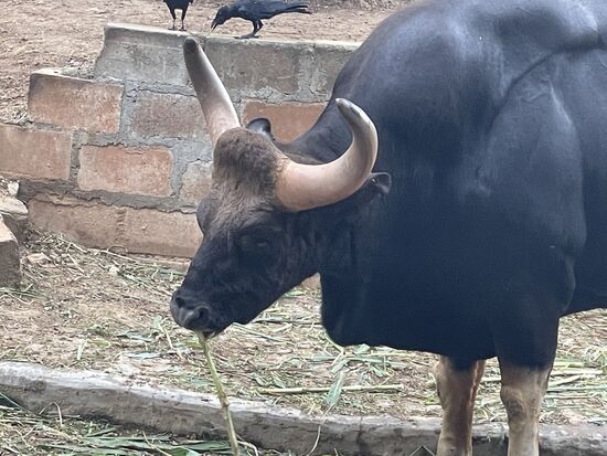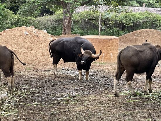 Zurück auf dem Hauptweg komme ich zum grossen Auslauf der Gaurs, der indischen Büffel. Sie entwickeln sich langsam zu meinen Lieblingstieren mit ihren zierlichen Beinen, die in weissen Strümpfen zu stecken scheinen, ihrer Ponyfrisur, den runden Hörnern und sympatischen Gesichtern. Ich bin voreingenommen, ich weiss.