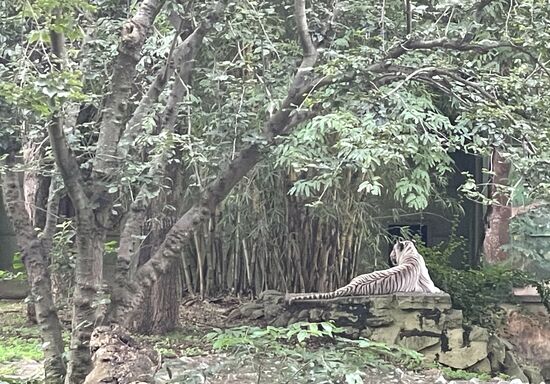 Weiss ist das nächste Tier, auch wenn es von all den Besuchern überhaupt nichts wissen will. Der weisse Tiger liegt weit hinten in seinem grossen Gehege und dreht uns den Rücken zu. Trotzdem ein schönes Bild, ein starkes Tier.