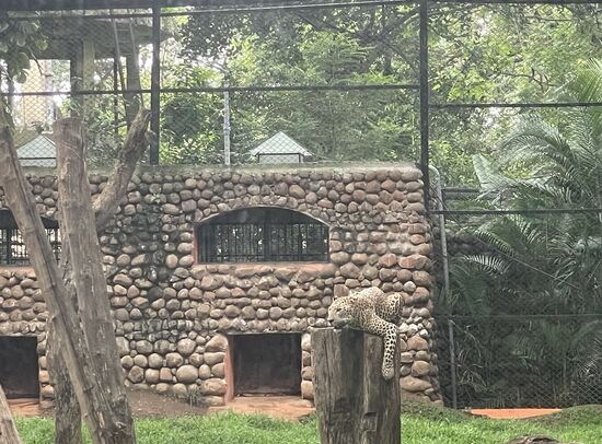 Auch einer der Leoparden im nächsten Gehege ist ziemlich entspannt. Lässig liegt er auf einem Baumstrunk, lässt seine Vorderpfote baumeln und zeigt den Besuchern sein Gesicht. Und dann kommt er mit einem Sprung von seinem Aussichtsposten herunter und keift kurz mit einem Rivalen im Nachbarsgehege, um sich dann wieder in den Schatten zu begeben. Nickerchen ist angesagt.
