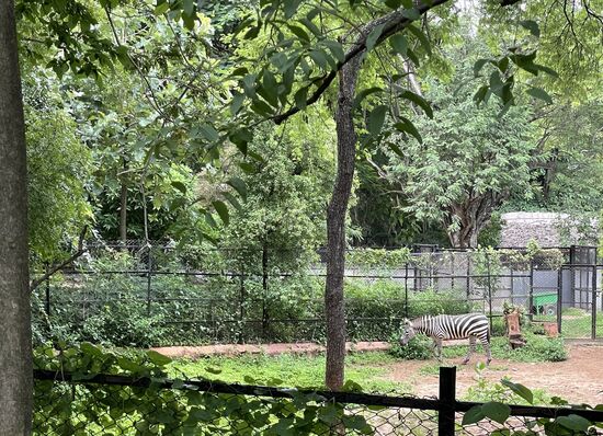 Auch der Tiger im nächsten Gehege hält sich möglichst weit weg von den Besuchern und liegt im Schatten, behält aber die Menschen im Blick, während das Zebra gemächlich davon läuft, als ich seinem grossen Gehege näher komme.