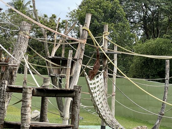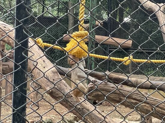 Am Schluss kommen noch ein paar Affen. Ein imposanter Schimpanse hockt auf einer Plattform und überblickt seine Umgebung, während sich die kleineren Lemurenaffen auf ihren Ästen herumahangeln und ein Baby-Rhesus-Äffchen speilt mit den gelben Kordeln, gut beobachtet von seiner Mutter, die in der Nähe hockt.