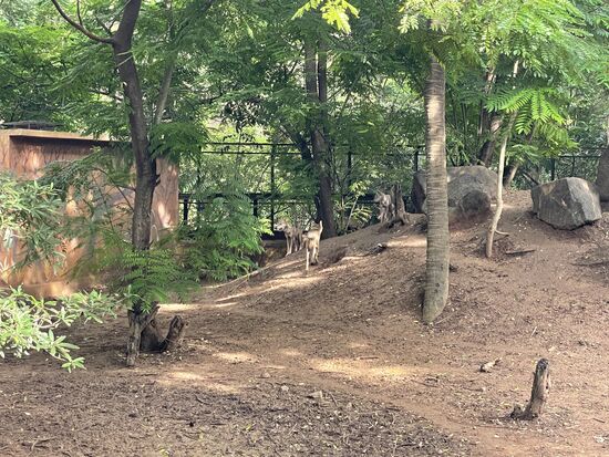 Ich sehe eine Weile den weissen Nashörnern zu, schicke ein Bild von ihnen einer Freundin, die sich für Nashörner interessiert, sehe dem Orang Utan zu, der sich durch seinen Klettergarten hangelt und komme zum grossen Gehege der indischen Grau-Wölfe. Ein ganzes Rudel versteckt sich hinter den Steinen und als ein paar Jungs sie mit einem Wolfsgeheul locken, heulen bald alle mit. Ein schauriger Gesang.