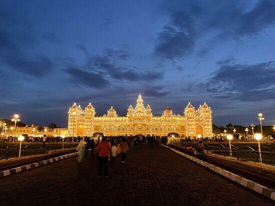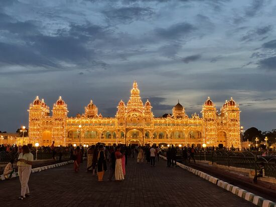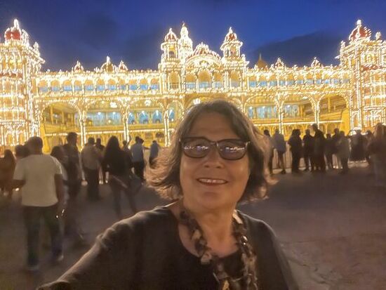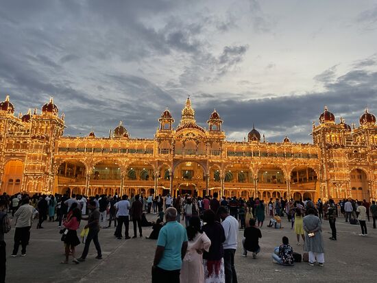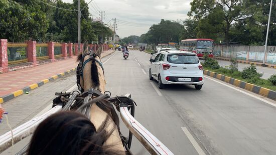 Also lasse ich mich von einer Kutsche zurück zum Palast fahren, denn dort soll heute Abend das Gebäude beleuchtet werden. Bevor wir losfahren, überlässt mir der Kutscher die Zügel und die Peitsche und macht mit meinem Handy ein paar Fotos von mir. "Lass die Peitsche knallen!" meint einer der Tuktukfahrer, als ich in Position sitze. "Nein, ich traue mich kaum sie zu halten", gebe ich zurück, "ich habe Angst, das Pferdchen könnte losgehen. "Und ich erst!" lacht Nasim, der Kutscher. "Wehe du fährst los!"