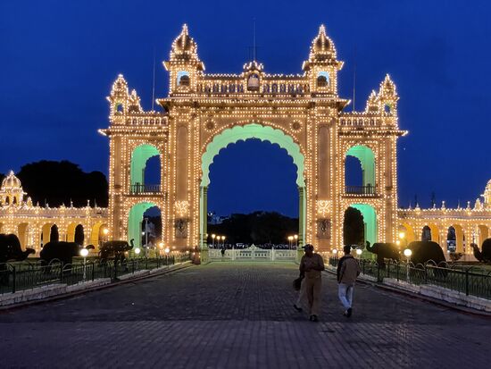 Ich schlendere über den Platz, staune in alle Richtungen. Auch das grosse Eingangstor gegenüber dem Palast erstrahlt wie aus einem Märchen mit seinem türkisfarbenen Licht.