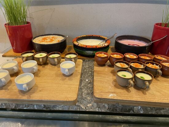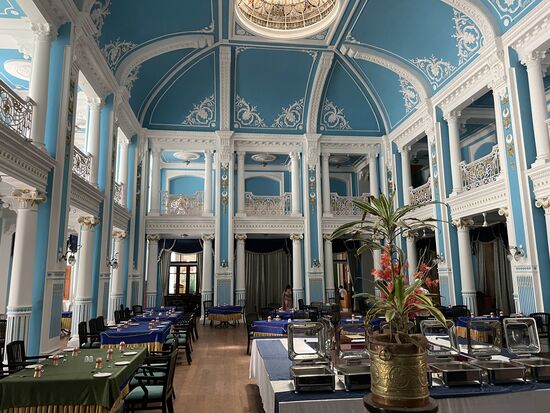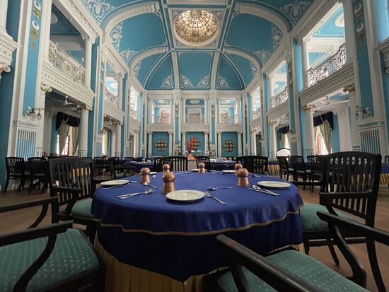 Dafür hält der Speisesaal was er verspricht. In einem frischen Blau gestrichen mit den weissen verspielten Schnörkeln kommt er aus einer völlig anderen Zeit. Wenn man sich die Sache allerdings von nahe anschaut, sieht man überall den Putz bröckeln. Der ganze Palast hätte dringend eine Renovation nötig.