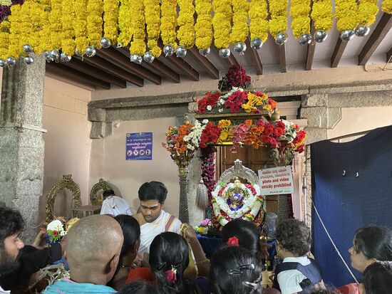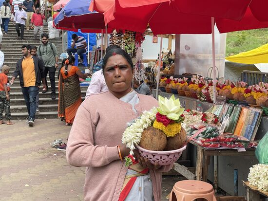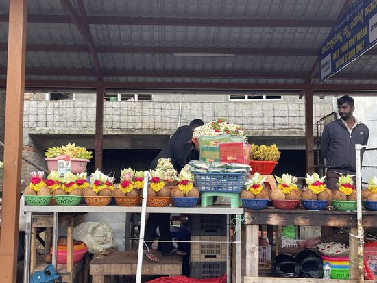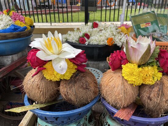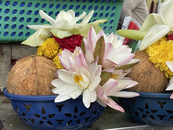 Überall werden Blumen verkauft. Mit diesen Gaben huldigt man der Göttin. Es duftet von Jasmin, roten Rosen und gelben Tagetes und halboffenen Lotusblumen. Von Verkäuferinnen, an grossen Blumenständen, in Plastikbecken werden sie angeboten. Zusammen mit getrockneten Kokosnüssen. Natürlich gibt es auch hier die langen Blumengebinde und es fällt mir nicht einfach, immer nein zu sagen.