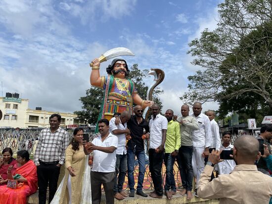 Wir fahren weiter und erreichen das grosse Parkplatz auf dem Hügel. Gut 1000 m ü.M sind wir hier, Mysore liegt auf gut 700 Metern. Es gibt einen Tempel, aber Shariff weist mich erst zu der grossen Figur auf der linken Seite. Es ist ein Büsewicht, der da da lanzeschwingend auf einem Podest steht. Umgeben von jungen Männern, die sich vor ihm fotografieren lassen.