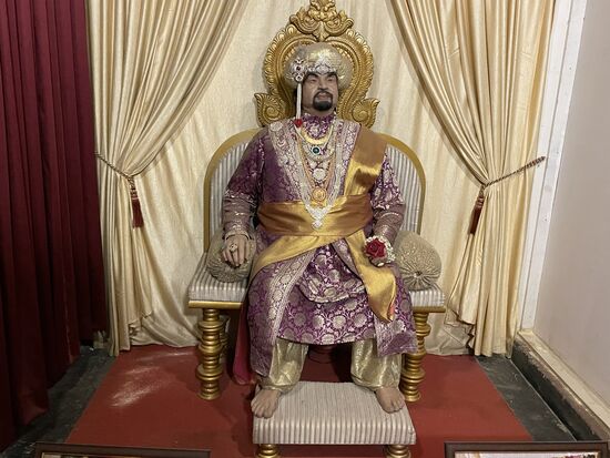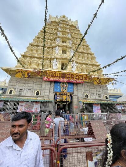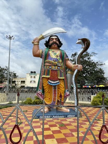 Natürlich musste ich es nachlesen, habe Shariffs Erklärungen mal wieder nicht auf Anhieb verstanden. Mahishasura, halb Büffel, halb Mensch war ein böser Dämon, der die Menschen lange Zeit bedrohte. Mahishasura soll die die Kräfte der Unwissenheit und des Chaos präsentieren, die durch äußere Erscheinungen verborgen sind. Er hatte die Eigenschaft bekommen, dass er nicht durch Menschen getötet werden könne. Erst durch die Göttin Durga konnte er bezwungen werden. Sie überwältigte ihn hier oben auf dem Hügel mit einem Dreizack und seither wird dieser Sieg jedes Jahr mit einem neuntägigen Fest gefeiert.