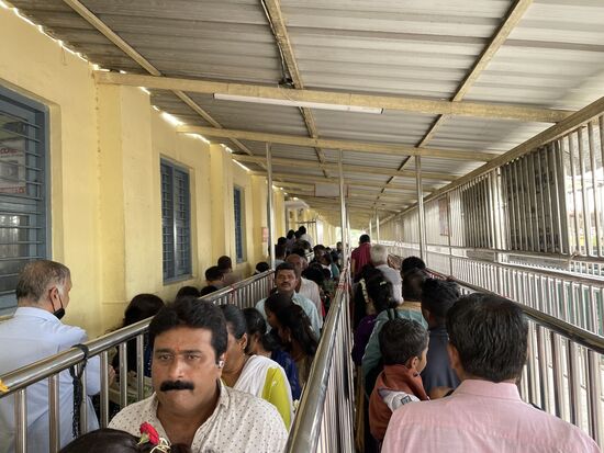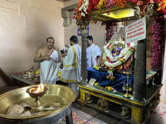 Ich weiss ja nicht, wie lange die Warteschlange auf der Gratisseite ist, denn sie ist auf der anderen Seite des Tempels, aber ich vermute, dass viele den Tipp mit der kürzeren Zeit bekommen haben. Es braucht ziemlich viel Geduld, aber nach 20 Minuten anstehen, bin ich drin. Ein paar Windungen um wenige Ecken, ich stehe in einem Hof, über mir die Pyramide des Tempels und vor mir huldigen die Gläubigen ihrer Gottheit. Sie geben ihre Gaben an einen der weiss gewandeten Priester, legen den einen oder anderen Geldschein in die Schale, halten die Hände kurz über die Flamme und dann über die eigene Stirn, falten die Hände andächtig zu einem Namaste und gehen weiter.