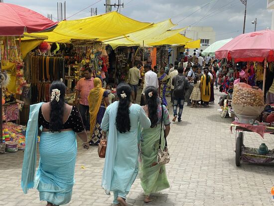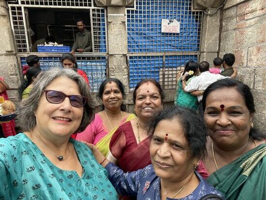 Ich verweile noch ein wenig im Hof, sehe den Menschen zu, wie sie sich gegenseitig in kleinen und grossen Gruppen fotografieren und frage ein paar Frauen, die sich in ihren farbigen Saris fototechnisch aufgestellt haben, ob sie auch kurz in meine Kamera gucken würden. Selbstverständlich, aber gleich darauf haben sie sich meiner bemächtigt. Eine spricht ein wenig Englisch und natürlich ist die erste Frage: Welches Land? Und schon wollen sie alle ein Bild von mir, wollen ein Selfie, drücken sich ihre Kameras gegenseitig in die Hand, ich werde jetzt also wieder auf vielen Erinnerungsbildern aus dem Chamundeshwari-Tempel auf dem Chamundi-Hügel von Mysore auftauchen.