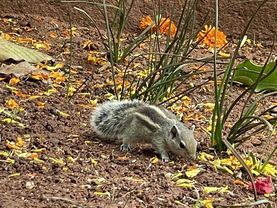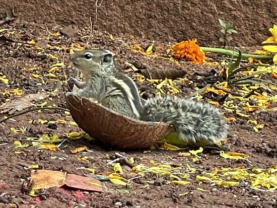 Langsam strebe ich dem Ausgang zu, ich habe genug von den Menschenmassen, die sich im Inneren des Hofes nur langsam bewegen, da entdecke ich dieses kleine Streifenhörnchen in einer Kokosnussschale unter dem grossen Baum. Zum ersten Mal gelingt es mir, eines dieser putzigen Tierchen zu fotografieren. Gesehen habe ich sie schon überall. Im Ayurveda-Resort kletterten sie die Palmstämme hinauf, rannten über die Wege, in Madurai sah ich sie an den Fassaden über die Kabel zu den Fenstersimsen klettern, doch noch nie waren sie so nahe und vor allem so ruhig.
