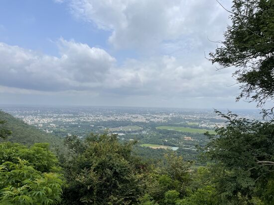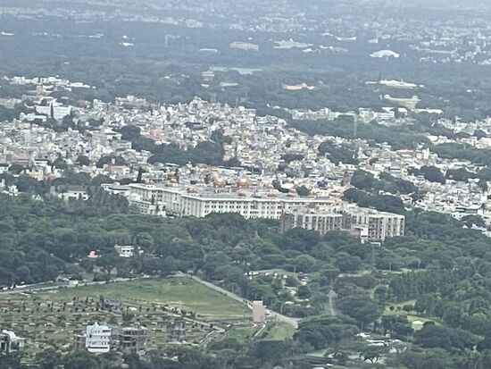 Wir fahren zurück, den Berg hinunter. Beim Aussichtspunkt bleiben wir kurz stehen. Dort unten liegt Mysora. Der Palast ist gut zu sehen und das riesige Gebäude dort unten mit den vielen Kuppeln ist das Krankenhaus.