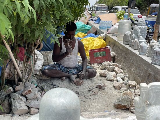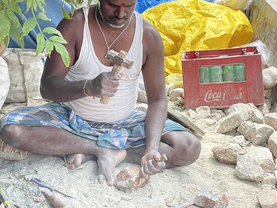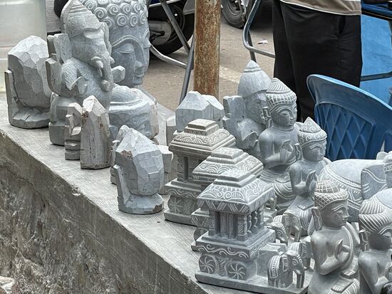 Eine Weile sehe ich noch dem Steinhauer zu. Er würde mir gern eine kleine Buddhabüste verkaufen, oder einen Tempel, oder wenigstens einen winzigen Elefanten. Ich winke ab, sehe ihm aber zu, wie er aus den groben Steinen, die rund um ihn liegen, die rohen Formen herausschlägt.
