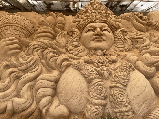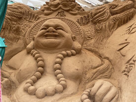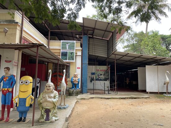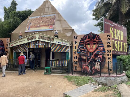 Wir halten an und das Museum erweist sich als riesiger Sandhaufen, in den verschiedene Figuren gestaltet wurden. Figuren aus der indischen Mythologie, aber auch nordamerikanische Indianer, ein dicker Buddha, eine moslemische Moschee, Tiere, Pyramiden, Inspirationen aus der ganzen Welt. Ein Plakat erklärt, dass das ganze 2014 von der einheimischen Künstlerin M N Gowri geschaffen wurde. Am Ende des Rundganges treffe ich auf ihren Vater, der mir stolz von seiner Tochter erzählt. Von den 115 Lastwagenladunen Sand, die hierher gebracht wurden. Vom Waschen und Sieben des Sandes, von den langen und intensiven Arbeiten, den vielen Skizzen, den Ideen seiner Tochter. Inzwischen lebt sie längst nicht mehr hier. Nur manchmal kommt sie noch zurück in ihren Heimatort. Besucht ihre Eltern und macht kleine Reparaturen an den Sandbildern, die von der Witterung immer wieder beeintrachtigt werden, denn das Ganze wird nur durch ein grosses Dach gesichert, ist aber völlig draussen.