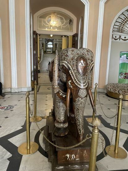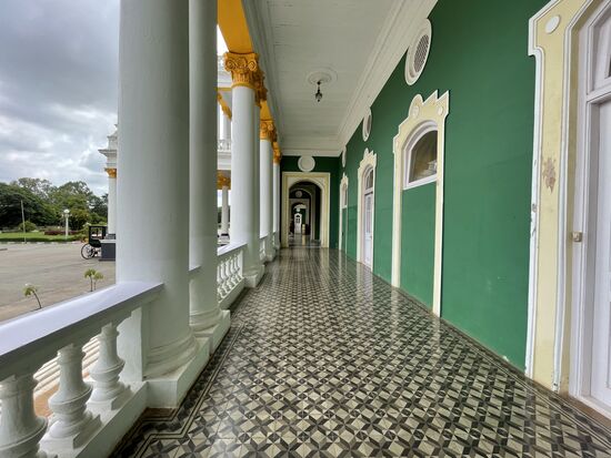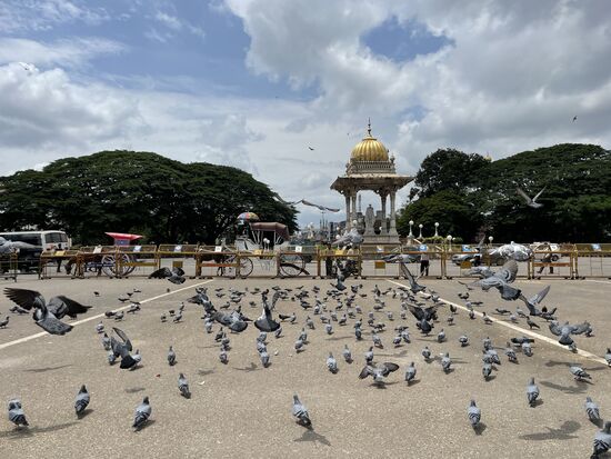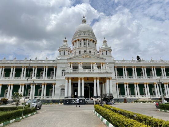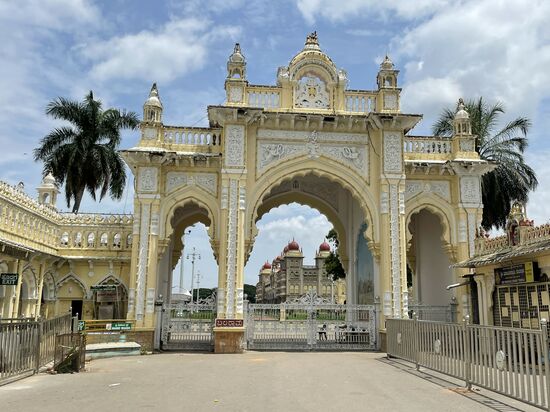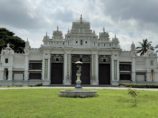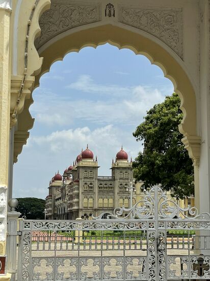 Wir fahren weiter und kommen zu einem grossen Gittertor mit einem Wärterhäuschen dabei. Es ist die Einfahrt zum Lalitha Mahal Palace. Einst der Wohnsitz der Könige, heute ein Hotel. Ich hatte davon bereits gelesen, als ich mein Hotel in Mysore gesucht hatte, aber das Hotel steht ziemlich weit weg vom Zentrum entfernt.