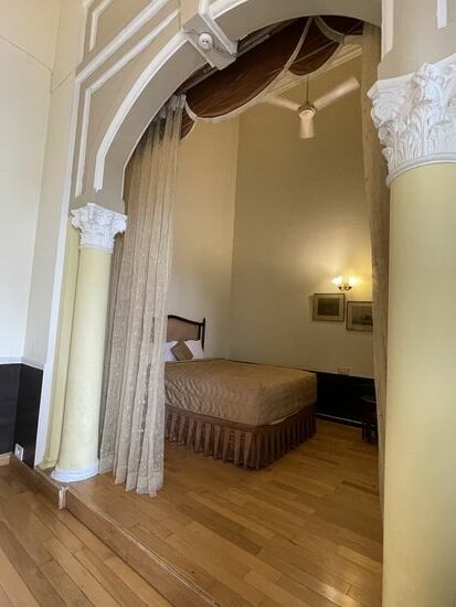 Das Zimmer ist zwar herrschaftlich hoch, das Bett wuchtig breit, in einem Separee mit vorgelagertem Eingangsbereich, und das Bad altmodisch mit uralten Armaturen, einer Badewanne auf Füssen. Das ganze nur mit einem kleinen Fenster über der Türe wirkt ziemlich dunkel. Gut habe ich mich nicht dafür entschieden.
