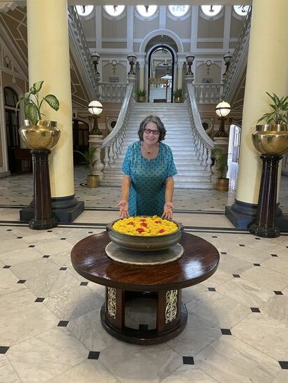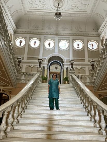 Bis zur Treppe darf man als Besucher gehen, weiter nicht. Ich beobachte einen der Angestellten, wie er für andere Besucher Fotos macht. Er weiss genau, wo sie sich hinstellen sollen, wie sie stehen, was sie tun sollen. Also gebe ich ihm mein Handy, bitte ihn, ein paar Fotos zu machen und er schickt mich zuerst zu den Blumen, die in einer weiten Wasserschale angeordnet sind. Dann soll ich hiinauf auf die Treppe. Und so entstehen also diese sehr repräsentativen Fotos, die mich wie die Schlossherrin zeigen. Die allerdings keine Stufe höher hätte steigen dürfen. Fotos können täuschen.