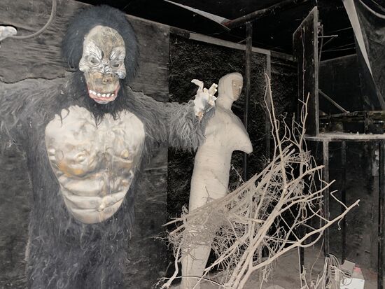 Plötzlich ein Schrei, ein ohrenzertrümmerndes Brüllen, ein rotes Licht weiter vorne, dann ein Sargdeckel, der sich kurz hebt, eine Leiche, ein Tier. Und dazu das Brüllen, das Schreien, das überhaupt nicht mehr aufhören will. Ich trete ein paar Schritte vor, es ist eine Geisterbahn zum selber durchlaufen.
