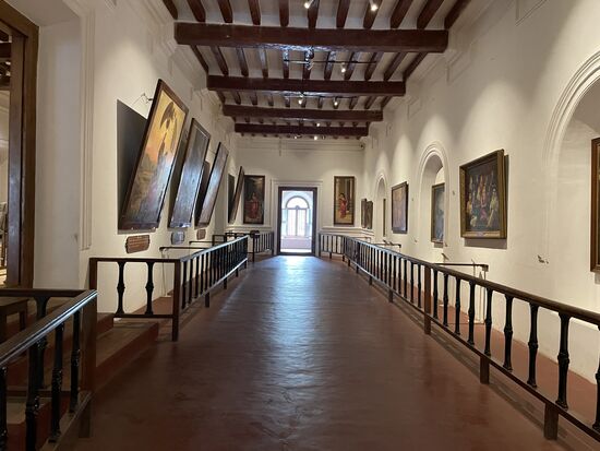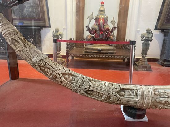 Ja das sehe ich ich. Aber nicht nur der Blick aus dem Bild folgt mir, auch der alte Mann folgt mir jetzt auf Schritt und Tritt, erklärt mir die Bilder, erklärt mir die Gegenstände, den elefantenköpfigen Ganesha, den grossen Elefantenzahn mit den vielen kleinen geschnitzten Bildern. Die Galerie im zweiten Stockwerk.