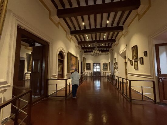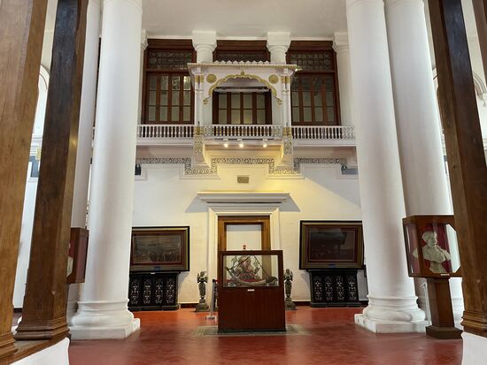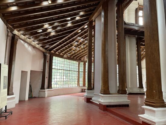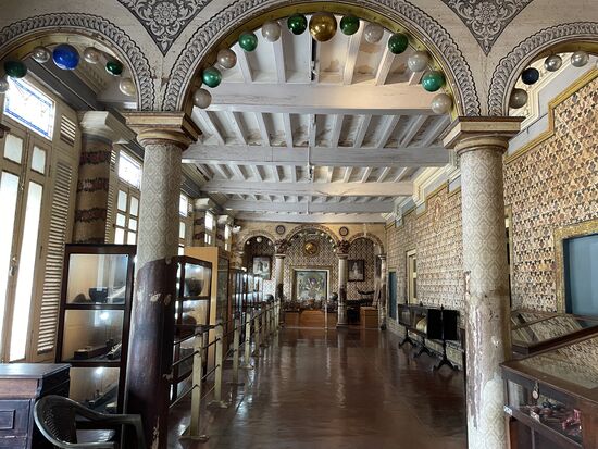 ich steige über knarrende hohe Holzstufen bis hinauf unter das Dach wo ein grosser Raum mit alten Tapeten und blumenumrankten Säulen ist. Hier werden in Vitrinen viele Kult-Gegenstände aus vergangenen Zeiten ausgestellt. Instrumente, Bilder, Fotos, Götter in all ihren Inkarnationen, Zeremoniengegenstände.