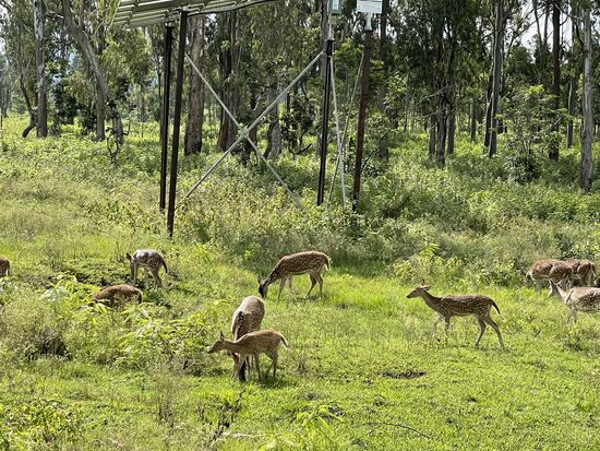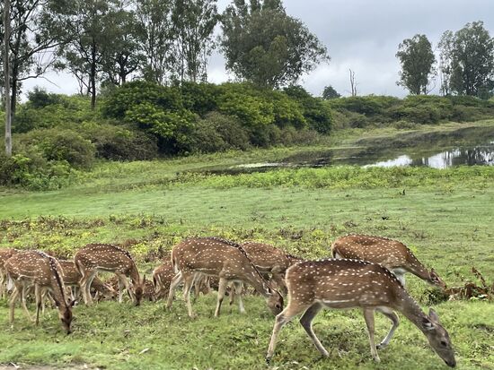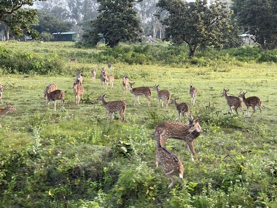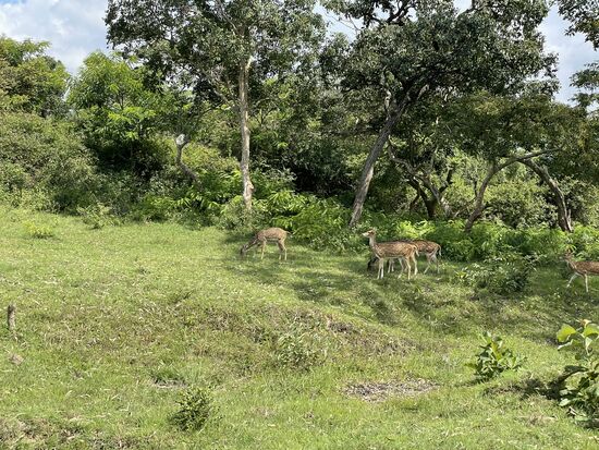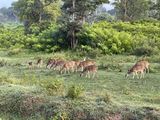 Bevor wir zurück auf die Hauptstrasse einschwenken begegnen wir noch einer grösseren Gruppe dieser getupften Rehe. Es sind Axishirsche und bei ihnen haben auch die erwachsenen Tiere weisse Tupfen auf dem ganzen Fell. Gesehen habe ich sie vor zwei Tagen auch im Zoo und danach gelesen, dass sie in Indien sehr weit verbreitet sind. Sie würden oft auch Bambi genannt. Das zeigt wieder einmal, wie gross der Einfluss von Hollywood-Filme ist. Denn ohne den Walt Disney-Film wäre der Name nicht bekannt.