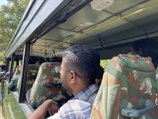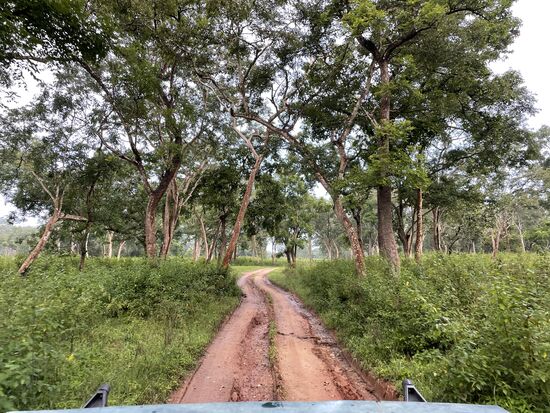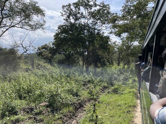 Wir sind auf Waldwegen unterwegs durch das niedrige Gebüsch, das auf beiden Seiten wächst. Zum Glück ist der Bus robust und die Leute ruhig, ohne aufgeregte Gesten, die die Tiere gleich wieder ins Dickicht vertreiben würden.