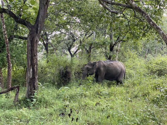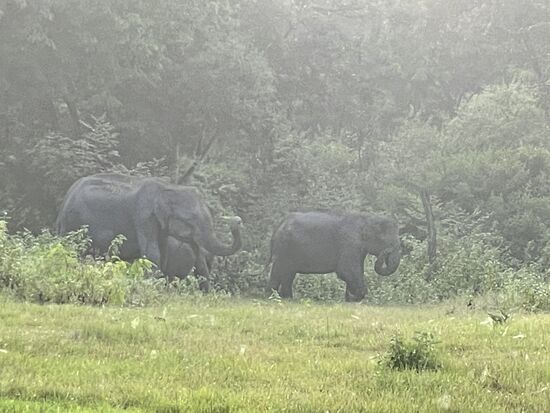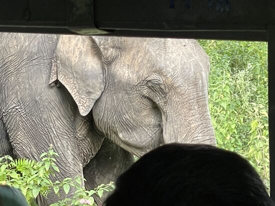 Einmal bleiben wir stehen, auf der rechten Seite sind zwei Elefanten soeben aus dem dichten Unterholz gekommen. Leider sitze ich auf der linken Seite des Buses, zwar kann ich die Elefanten sehen, aber durch die Sitzreihen mit den Leuten, die alle ihre Hälse strecken, kann ich die grossen Tiere knapp erkennen.