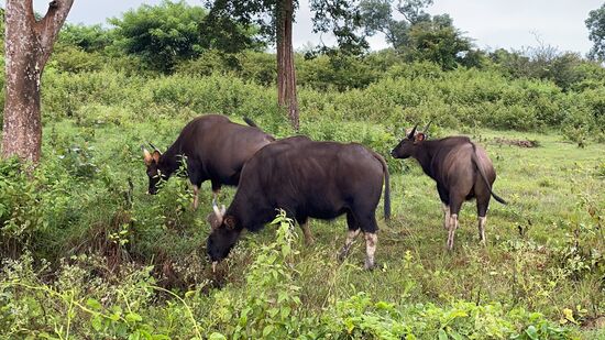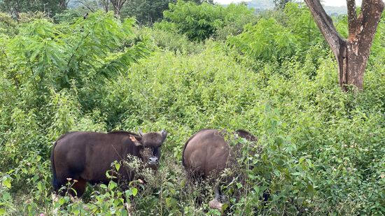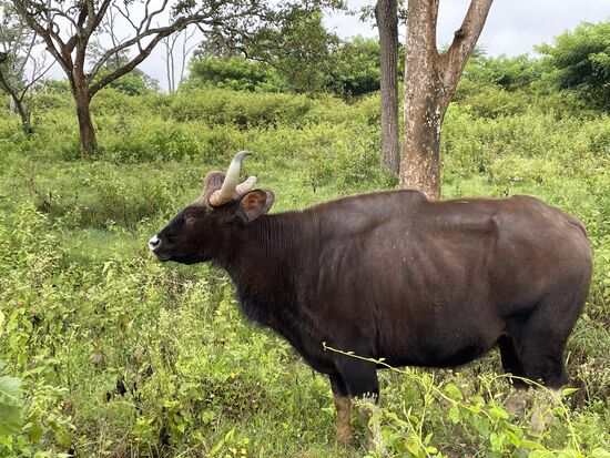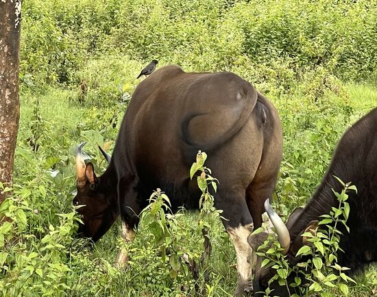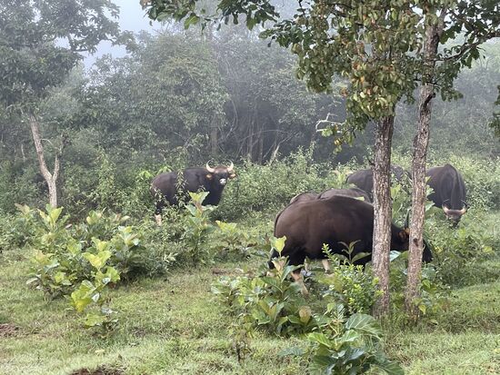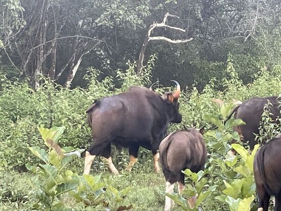 Zum Abschluss treffen wir auf unserer Seite noch ein paar indische Bisons Diese massigen Tiere mit den runden Hörnern stehen in den Büschen und glotzen uns an. Eigentlich sehen sie ganz sympatisch aus mit ihrer hohen Stirntolle. Gaur heissen sie und sie scheinen ziemlich weit verbreitet zu sein.