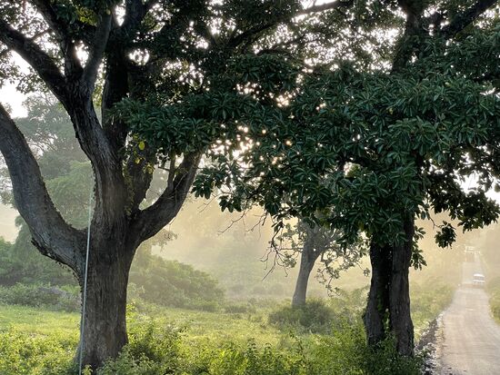 "Dort oben", der Fahrer zeigt mit den Händen in die Äste und da oben turnen tatsächlich ein paar Affen durch die Bäume. Und ich merke wieder einmal, wie faszinierend es ist, die Tiere in der Wildnis zu sehen, Auch wenn es nur ein paar Affen sind, es packt einen immer sofort. Mit der Kamera sind die Affen in den Bäumen allerdings nicht zu erkenenn, aber wichtiger ist, dass ich sie gesehen habe.