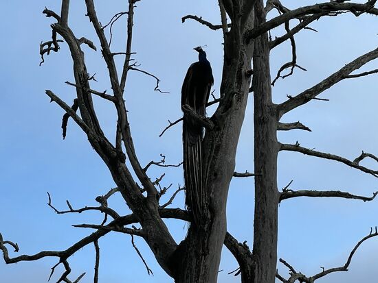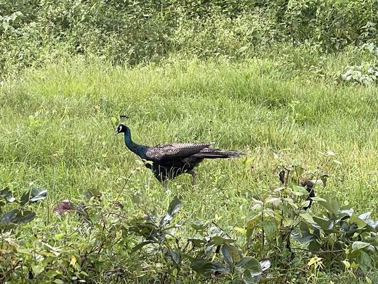 Das nächste was uns begegnet ist ein Pfau. Der Pfau gilt in Indien als heilig., er ist der Nationalvogel. Es ist ein junges Männchen, das hier auf der Suche nach Nahrung durch das Gras stolziert. Und nicht weit vom ersten Pfau können wir auf einem Baum einen weiteren Pfau erkennen. Mitsamt seinem langen Schweif flattert er von Ast zu Ast und lässt seinen Blick über die Gegend schweifen. Ein stolzer Anblick, auch wenn sie Farben im Gegenlicht der Sonne noch nicht zum Leuchten kommen.