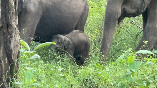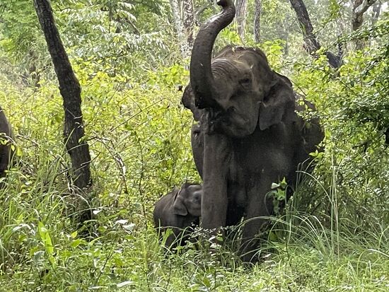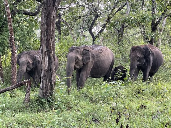 Tiger haben wir keinen angetroffen, aber eine kleine Herde Elefanten. Drei weibliche Tiere sind es, die rechts aus dem Dickicht kommen. Erst auf den zweiten Blick können wir dabei die beiden Kleinen entdecken. Sie bleiben gut geschützt ganz nahe bei ihren Müttern in der Mitte der Gruppe. Das Baby ist gerade einen Monat alt, weiss der Guia und es sucht immer wieder die Zitzen seiner Mutter.