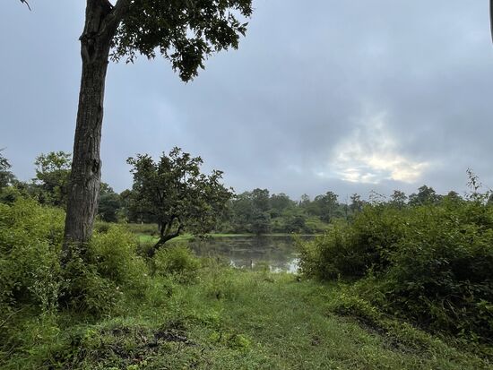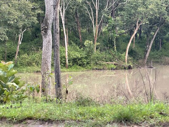Wir fahren weiter durch das Gelände, kommen an kleinen Wasserstellen vorbei, fahren auf den schmalen Fahrspuren, die durch den Regen in der Nacht völlig aufgeweicht sind. Hier kommt man tatsächlich nur mit dem Vierradantrieb und den hohen Rädern durch. Manchmal überqueren wir eine Furt mit Wasser, und der Driver muss genau aufpassen, wie er die Spur auf dem weichen Untergrund behält. Und ich suche das Ufer ab, ob nicht vielleicht doch irgendwo ein Tiger hier seinen Durst stillt, oder irgendwo auf dem Ast eines abgestorbenen Baumes liegt.