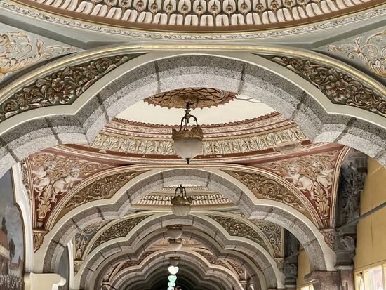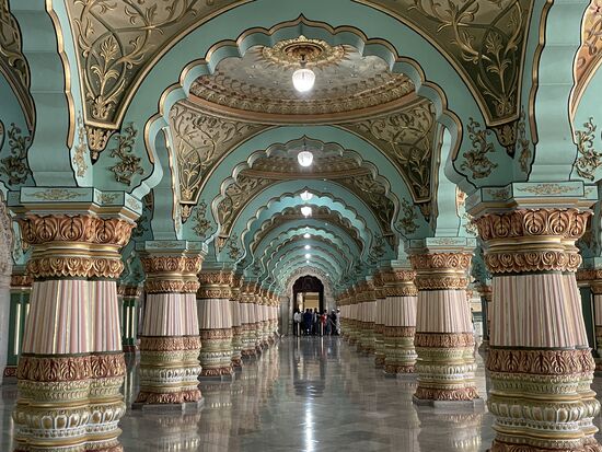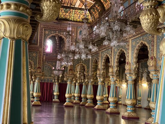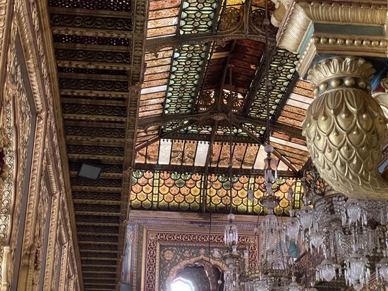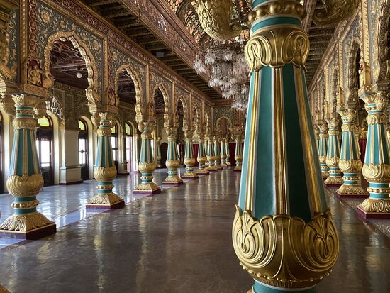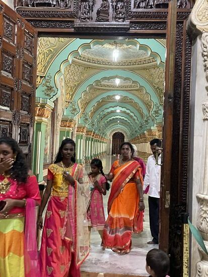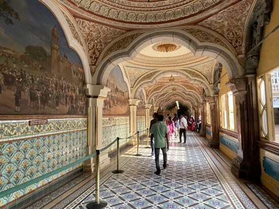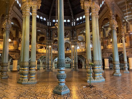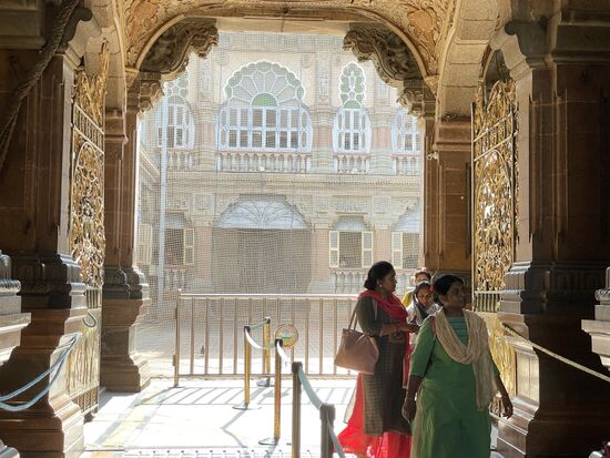 Ich nehme mir enorm viel Zeit. Vor der Türe, die zu dem Saal mit den türkisfarbenen Säulen geht, bleibe ich zehn Minuten stehen. Warte bis niemand mehr vor der Kamera steht. Doch auch wenn nicht gar so viele Leute hier sind, jemand kommt immer, bleibt stehen, sieht sich um, wo seine Freunde sind, macht selber ein paar Aufnahmen. Er hilft nichts, am Schluss freue ich mich über die Frauen in ihren roten Saris, die gerade hereinkommen. Und da es gar kein Problem ist, fremde Leute zu fotografieren, winke ich nur kurz, bevor ich mich dem nächsten Sujet widme.