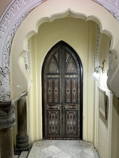 Diese Intarsien mit einem tanzenden Gott sind aus Elfenbein. Darum ist die Türe auch mit einer Glasscheibe geschützt.