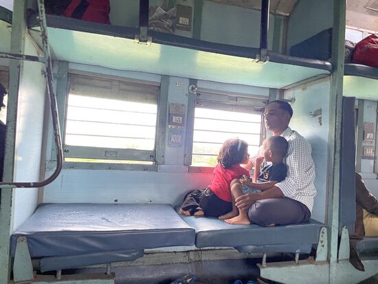 In der Nacht hat es geregnet, das Fenster, das gestern noch offen war und durch das die Luft hereinwehte, ist jetzt geschlossen. Ich hatte gar nicht gesehen, dass es Fensterscheiben gibt, die man herunterziehen kann. Es wird wohl mein Nachbar gewesen sein, der mich vor den herein spritzenden Regentropfen geschützt hat. Jetzt kann ich es wieder öffnen. Durch die vergitterten Fenster sehe ich die Landschaft vorbei ziehen. Weite hellgrüne Reisfelder, manchmal ein Fluss, manchmal fahren wir an ein paar Häusern vorbei, kleinen Dörfern.