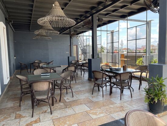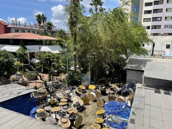 Stunden später öffne ich die Vorhänge und staune, wo ich gelandet bin. Im Hinterhof zum Hotel lagern, respektive liegen viele Kabelrollen. Das scheint irgendwie eine Schutthalde für Kabel zu sein. Oder werden die noch gebraucht? Es ist der letzte Moment für das Frühstück, also gehe ich in das Restaurant im 1. Stock. Nur fürs Frühstück, hat mir der Nachtportier noch gesagt, das Restaurant sei sonst nicht offen. Es gibt ein kleines Buffet, aber etwas ungewohnt ist es schon. Es gibt nur warme Speisen und ausserdem Tee oder Instant-Kaffee. Werde mich noch etwas umgewöhnen müssen, aber fürs erste reicht es. Danach gehe ich aufs Dach, denn dort müsste laut Hotelbeschreibung eine Roof-Top-Bar sein. Ja, die gibt es, aber die ist zurzeit gar nicht in Betrieb. Corona hat vieles verändert.