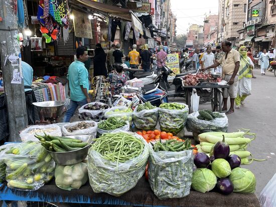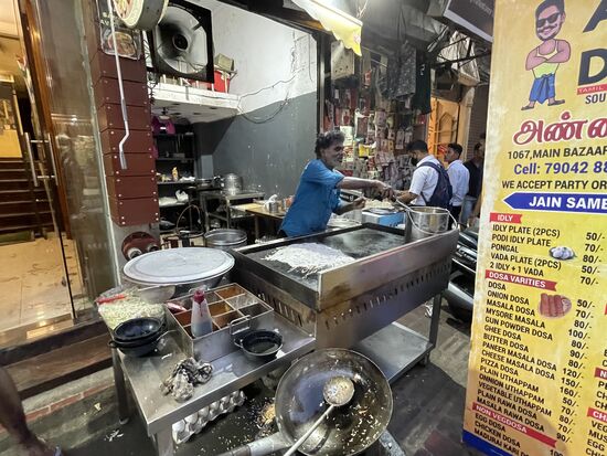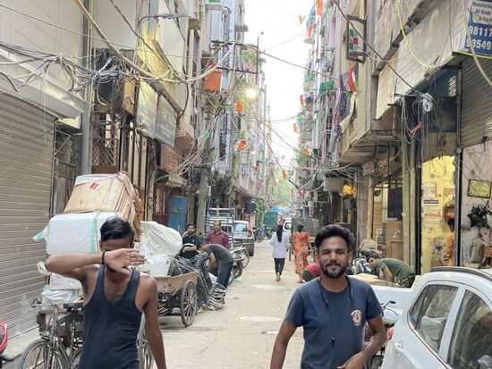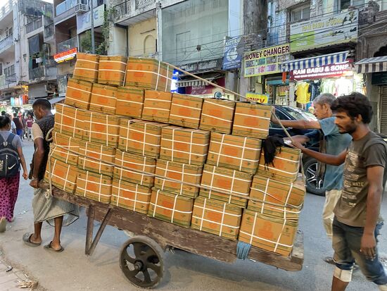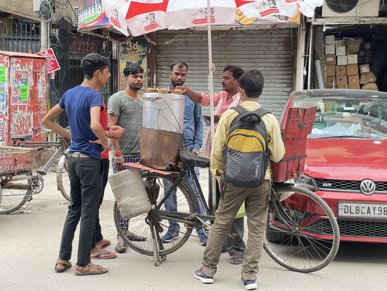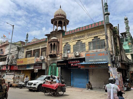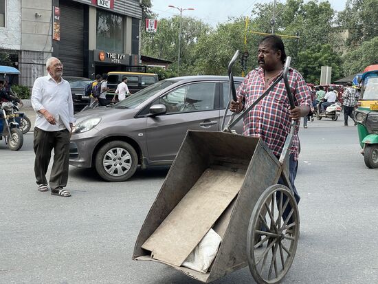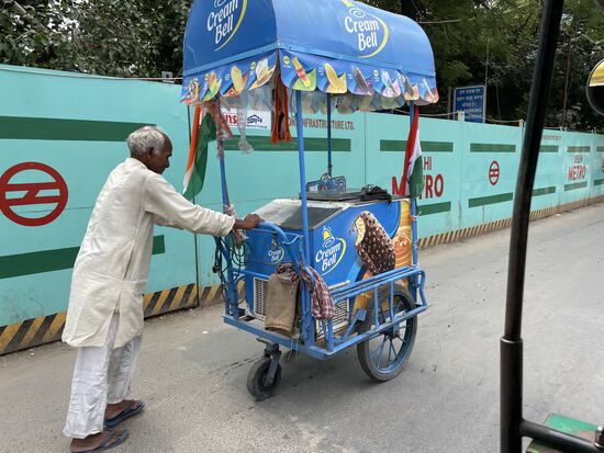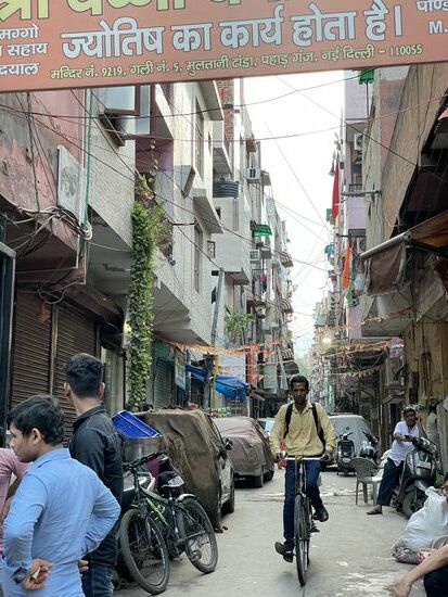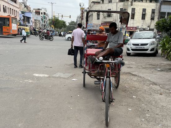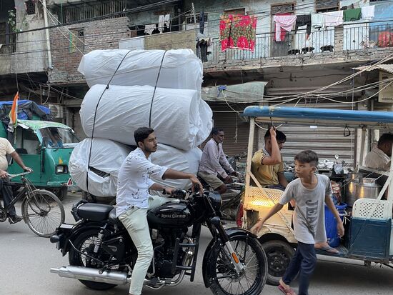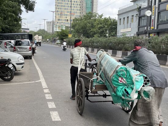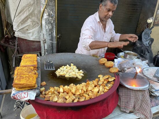 Nach den kleinen Gassen schwenke ich zurück zu einer der Hauptstrassen. Hier ist der Verkehr erstaunlich. Was sich da alles mit den Autos die Strasse teilt. Es gibt wieder jede Menge Tuktuks, in Mumbai hatte ich keine mehr gesehen, jedenfalls nicht da, wo mein Hotel lag. Und es gibt Fahrräder und Rikscha-Fahrer, Räder mit riesigen Lasten direkt auf dem Fahrrad oder einem Aufbau, der je nachdem vor dem Fahrer montiert oder hinter ihm hergezogen wird. Handwagen, werden über die Kreuzung manövriert, der Eisverkäufer stösst seinen Verkaufsstand vor sich her, zwischen allen anderen zwängen sich die unzähligen Motorräder und alles bleibt immer im Fluss. Kaum je bleibt jemand stehen, es wird ausgewichen, es wird gehupt, aber es ist nie ein agressives Hupen, es heisst eher: Ich bin da, ich will da vorbei, mach Platz. Platz wird zwar kaum gemacht, und auch wenn manchmal nur Zentimeter fehlen, es fährt, es läuft, es geht immer weiter. Auch Fussgänger müssen sich dem System anpassen, laufen über die Strasse, laufen weiter, wenn ein Auto kommt, weichen kurz aus, gehen weiter. Der Vortritt gehört dem, der ihn sich nimmt.
