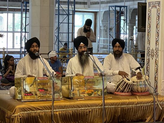 Ich darf sogar hinein, was ja nicht in jeder Moschee selbstverständlich ist. Drinnen ertönen eigenartige Klänge. Zwei Musikanten sitzen auf einem Podest und entlocken ihren Saiteninstrumenten eigenartige Töne, der dritte schlägt dazu die Trommel. Und alle drei singen. Menschen kommen, verneigen sich vor dem goldenen Heiligtum, bringen Blumen oder Geld und setzen sich irgendwo in der Nàhe hin, verharren in Meditation oder Gebet.