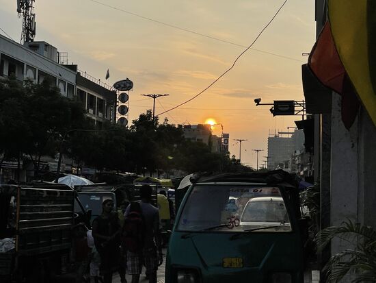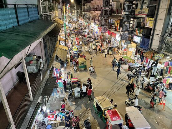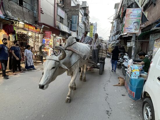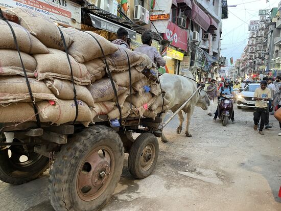 Es wird jetzt schnell dunkel, die Lichter in den kleinen Läden gehen an, der Verkehr wird dichter, die Gassen enger. Und da kommt mir doch tatsächlich in all dem Gewimmel ein Ochsenkarren entgegen. Gutmütig trottet das Tier durch die Menge. Auf seinem Wagen liegen schwere Reissäcke. Ich muss ihm einen Moment hinterher laufen, kann kaum glauben, wie das Gefährt es durch all die anderen Fahrzeuge schafft. Natürlich wird von allen Seiten gehupt, doch dem Tier scheint das nichts auszumachen.