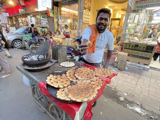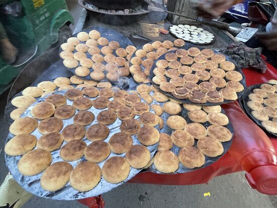 Der Bäcker, der die kleinen Küchlein brät, bietet mir eines an. Es schmeckt sehr fein. Süss und mürbe.