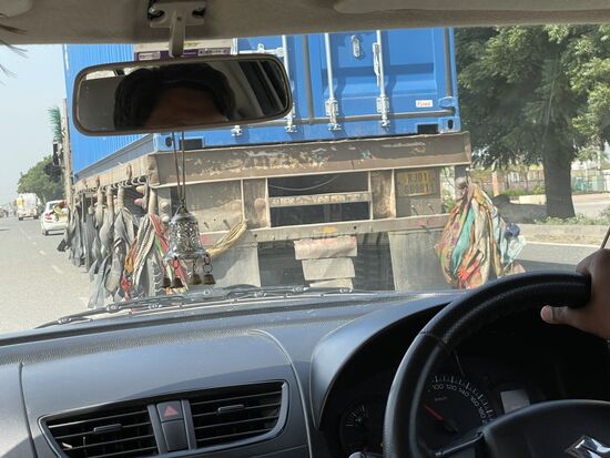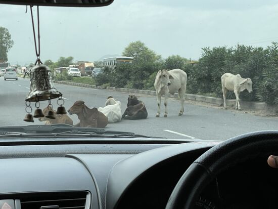 Wir sind unterwegs ins knapp 300 km entfernte Jaipur, ein erster Höhepunkt von Rajasthan. Oft fahren wir auf der Autobahn. Das heisst 2-3-spurige Fahrbahn in beide Richtungen. Die Strasse führt durch Dörfer, an Industriegebieten vorbei. Manchmal endet die Autobahn abrupt, die Strasse wird schmal, ja zwischendurch ist sie nicht einmal mehr asphaltiert. Jedenfalls für ein paar Meter. Oder sie wird zu einer Baustelle. Wir begegnen grossen Lastwaren, überholen Tuktuks oder Motorräder. Meistens sitzen zwei Leute darauf, oft auch drei oder vier. Es kommt soweit, dass ich, wenn ich nur einen Fahrer sehe, mich frage, ob er seine Passagiere wohl verloren hätte.