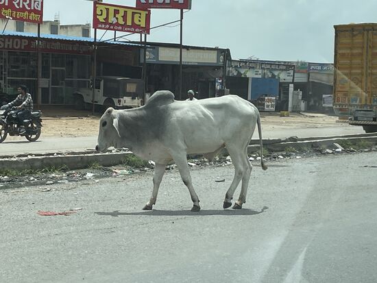 Das Schönste aber sind die Kühe auf der Autobahn. Da liegen sie also auf dem Mittelstreifen, der oft etwas begrünt ist. Oder sie liegen auf den Fahrbahnen, glotzen die Autos an und machen keine Anstalten, sich zu bewegen. Und auch hier gilt, wenn jedes Überholen von Motorrädern, anderen PWs oder Lastwagen immer mit einem lauten Hupen begleitet sind, bei den Kühen fährt man ruhig vorbei. Niemals würde man sie mit Hupen erschrecken. Überholt wird übrigens grundsätzlich da wo es irgendwie möglich ist. Rechts und links, in Ortschaften, auf breiten genauso wie auf schmalen Strassen. Es gilt das Recht des Schnelleren, des Geschickteren, des Stärkeren oder des Frecheren.