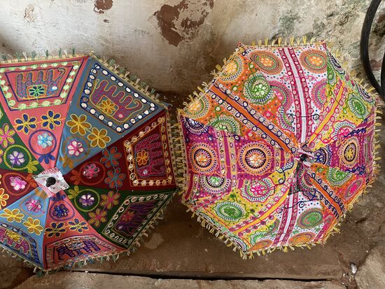 Wir fahren noch ein paar Meter weiter hinauf, bis zum Parkplatz, da wo es nur noch zu Fuss hinein geht in den gewaltigen Palast. Und da sitzen auch die Verkäufer, die alles mögliche anbieten. Unter anderem tatsächlich diese wunderschönen kleinen Schirme, die wohl nicht für Regen gedacht sind. Und damit hätte ich also meinen heutigen Schirm gefunden. Ich bin in Rajasthan.