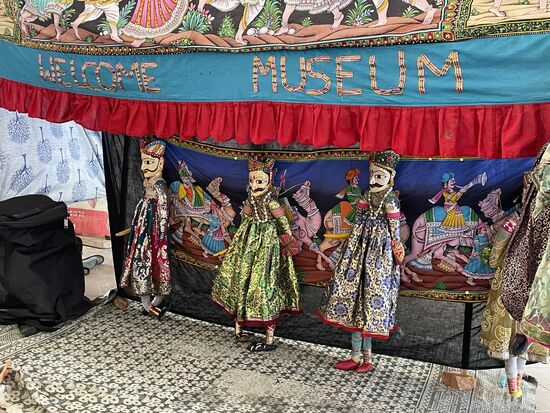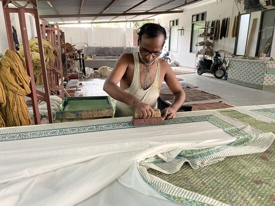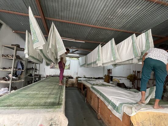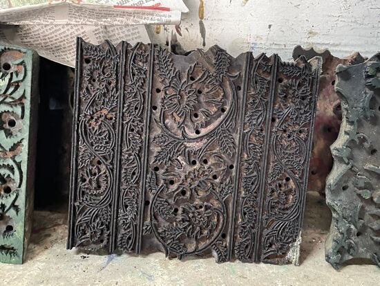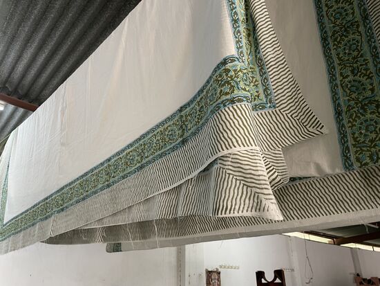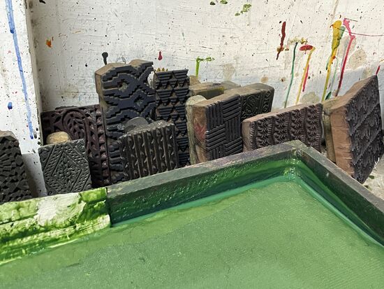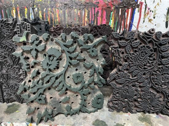 Und jetzt treffe ich heute in Jaipur genau auf diese Technik. Und genau wie bei uns, müssen die Tücher zum Trocknen aufgehängt werden. Dafür gibt es in dem Raum lange Stangen. Und die Druckmodels sind fantastisch, die Muster aufwändig.
