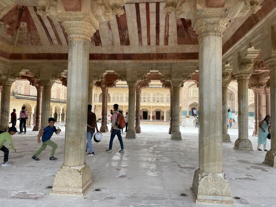 Der Palast ist ungeheuer. Riesig. Eine Kombination von Hindu-Kultur und Islam, um die damaligen zwei Religionen zu verbinden. Darum gibt es Säulen mit ausschliesslich Ornamenten - der Islam lässt keine lebendigen Symbole zu und dann gibt es geschnitzte Blumen und Tiere.