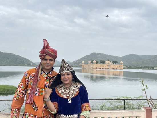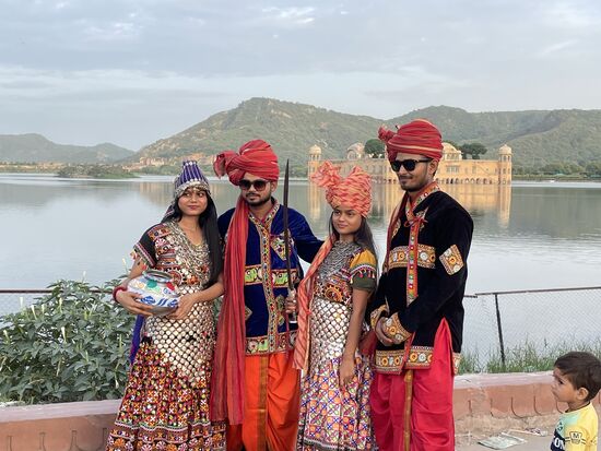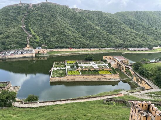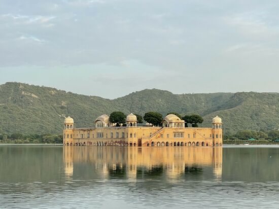 Noch einmal bleiben wir an einem künstlichen See stehen. Hier ist der beste Blick um das Wasserschloss, das Jal Mahan zu sehen. Es ist weder ein Hotel noch ist es sonst zugänglich. Auch wieder ein wunderschöner, harmonischer Bau, der sich bei ruhigem Wasser bestimmt ganz toll im Wasser spiegelt.